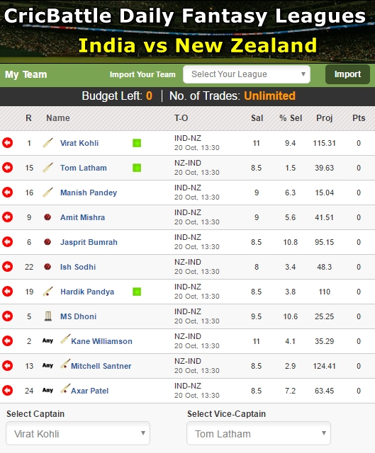 · My XI – Virat Kohli (Captain), Tom Latham (Vice-Captain), Hardik Pandya, Amit Mishra, Manish Pandey, Jasprit Bumrah, Ish Sodhi, MS Dhoni, Kane Williamson, Mitchell Santner, Axar Patel
