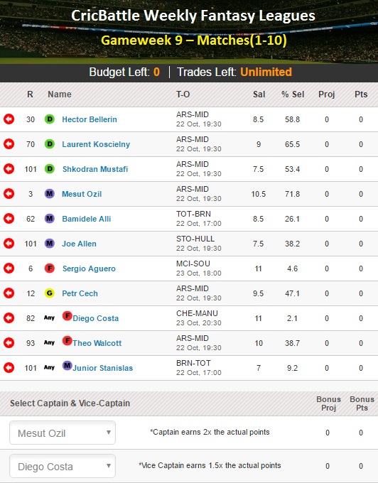 My XI – Mesut Ozil (Captain), Diego Costa (Vice-Captain), Theo Walcott, Petr Cech(GK), Hector Bellerin, Laurent Koscielny, Shkodran Mustafi, Bamidele Alli, Joe Allen, Sergio Aguero, Junior Stanislas.