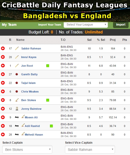 My XI – Ben Stokes (Captain), Sabir Rahman (Vice-Captain), Jonny Bairstow, Moeen Ali, Adil Rashid, Imrul Kayes, Joe Root, Gareth Batty, Mehedi Hasan, Taijul Islam, Chris Woakes