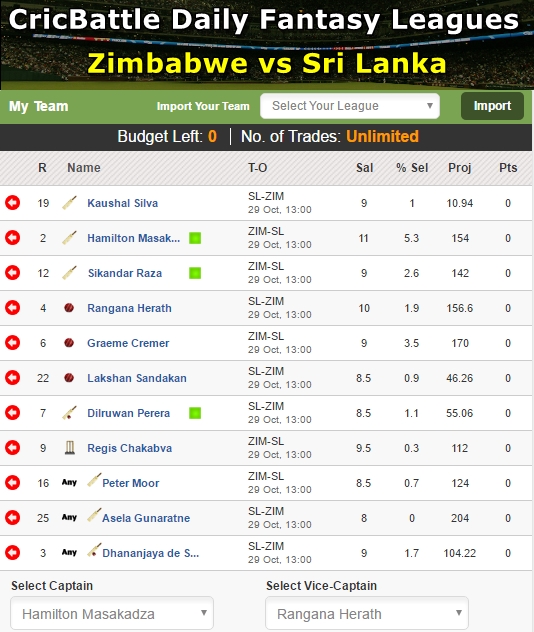 My XI – Hamilton Masakadza (Captain),Rangana Herath (Vice-Captain), Kaushal Silva, Graeme Creamer, Sikandar Raza, Lakshan Sandakan, Dilruwan Perera, Regis Chakabva, Peter Moor, Asela Gunaratne, Dhananjaya de Silva