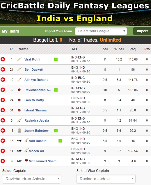 · My XI – R Ashwin (Captain), R Jadeja (Vice-Captain), Virat Kohli, Johny Bairstow, Ben Duckett, Ajinkya Rahane, Gareth Batty, Ishant Sharma, Adil Rashid, Moeen Ali, Mohammed Shami