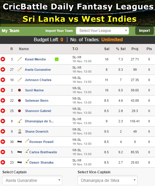 My XI – Asela Gunaratne (Captain),Dhananjay de Silva (Vice-Captain), Kusal Mendis, Shane Dowrich, Johnson Charles, Rovman Powell, Sunil Narine, Sulieman Benn, Shannon Gabriel, Carlos Brathwaite, Dasun Shanaka