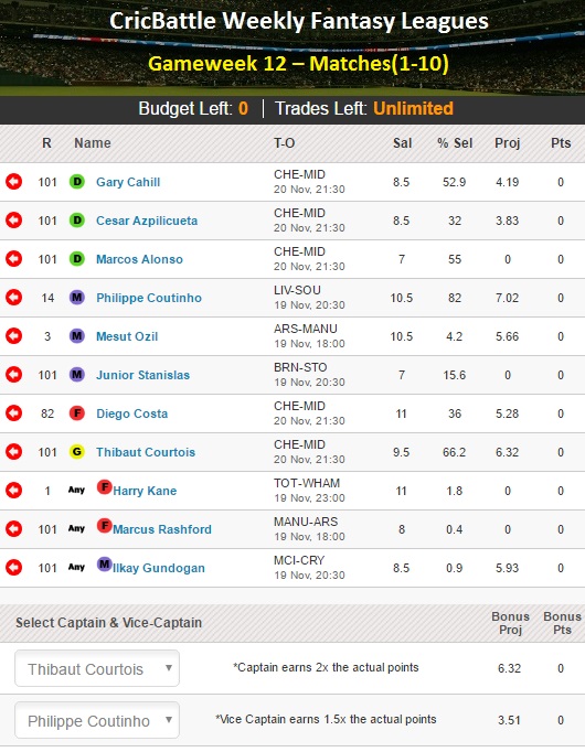 My XI – Thibaut Courtois(GK & Captain), Philippe Coutinho(Vice-Captain), Marcos Alonso, Gary Cahill, Cesar Azpilicueta, Ilkay Gundogan, Mesut Ozil, Junior Stanislas, Diego Costa, Harry Kane, Marcus Rashford.