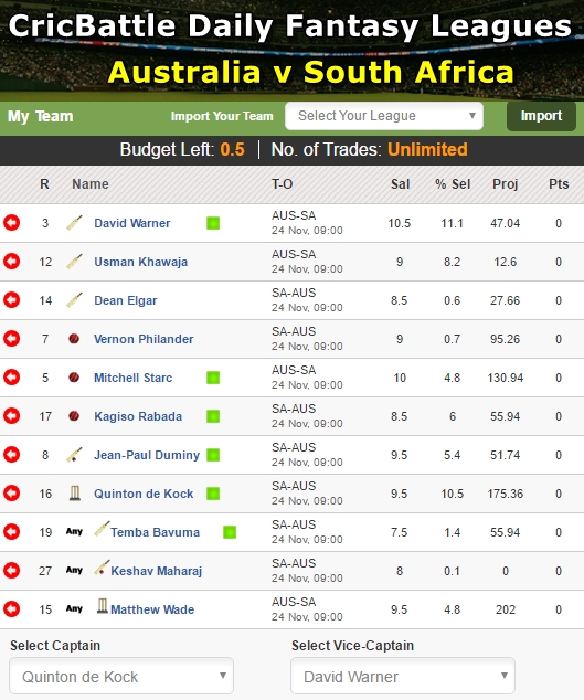 · My XI –Quinton de Kock (Captain), David Warner (Vice-Captain), JP Duminy, Dean Elgar, Temba Bavuma, Mitchell Starc, Usman Khawaja, Vernon Philander, Keshav Maharaj, Kagiso Rabada, Matthew Wade