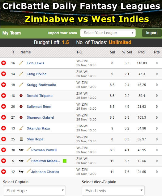 My XI – Shai Hope (Captain), Evin Lewis (Vice-Captain), Craig Ervine, Sikandar Raza, Kraigg Brathwaite, Rovman Powell, Donald Tiripano, Sulieman Benn, Shannon Gabriel, Hamilton Masakadza, Johnson Charles