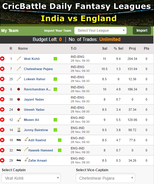 My XI – Virat Kohli (Captain), C Pujara (Vice-Captain), Johny Bairstow, R Ashwin, Adil Rashid, Moeen Ali, Lokesh Rahul, Haseeb Hameed, Jayant Yadav, Umesh Yadav, Zafar Ansari