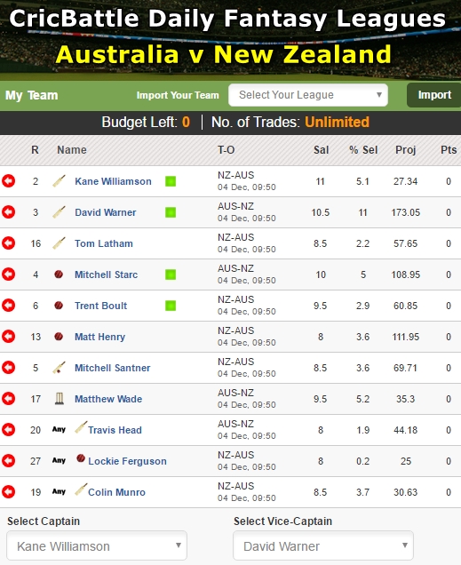My XI – K Willamson (Captain), David Warner (Vice-Captain), Mitchell Starc, Trent Boult, Tom Latham, Matt Henry, Mitchell Santner, Matthew Wade, Travis Head, Lockie Ferguson, Colin Munro