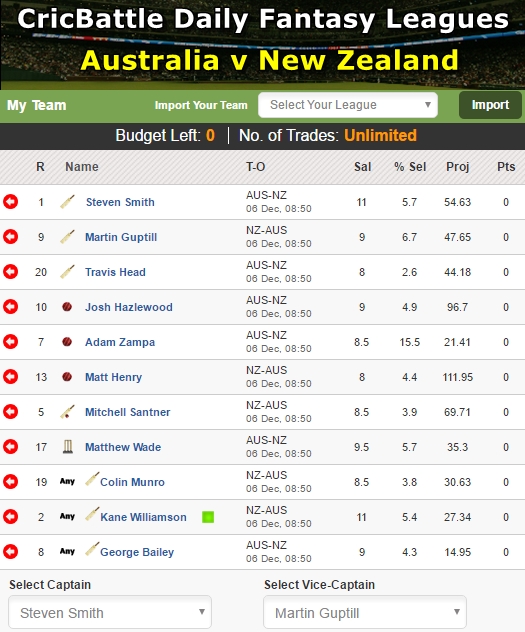 My XI – Steve Smith (Captain), Martin Guptill (Vice-Captain),Josh Hazelwood, Travis Head, Colin Munro, Adam Zampa, Matt Henry, Matthew Wade, Mitchell Santner, Kane Williamson, George Bailey