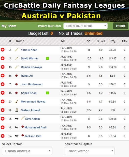 My XI – U Khawaja (Captain),David Warner (Vice-Captain),Mohammad Amir, Younis Khan, Josh Hazlewood, Sohail Khan, Mohammad Nawaz, Sarfraz Ahmed, Rahat Ali, Sami Aslam, Jackson Bird
