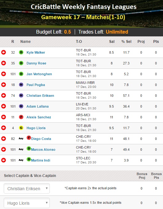 My XI – Christian Eriksen(Captain), Hugo Lloris(GK & Vice-Captain), Diego Costa, Alexis Sanchez, Kyle Walker, Danny Rose, Marcos Alonso, Paul Pogba, Adam Lallana, Martins Indi, Jan Vertonghen.