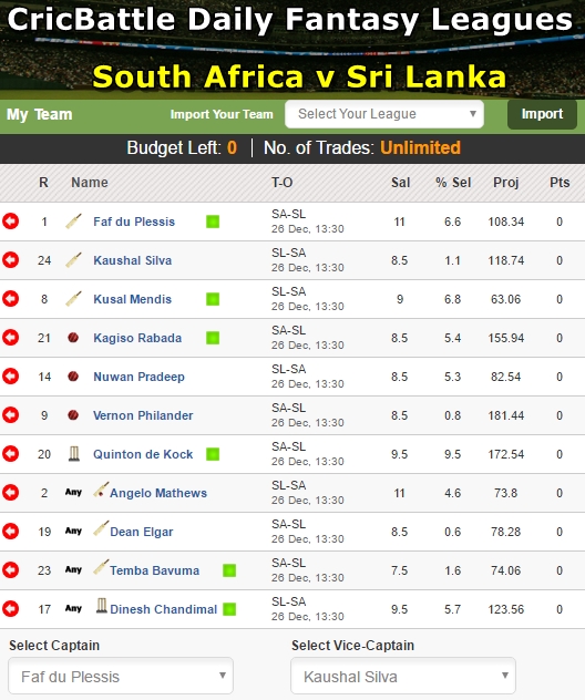 My XI – Faf du Plessis (Captain),Kaushal Silva (Vice-Captain), Dilruwan Perera, Kagiso Rabada, Vernon Philander, Quinton de Kock, Angelo Mathews, Kusal Mendis, Dean Elgar, Temba Bavuma, Dinesh Chandimal