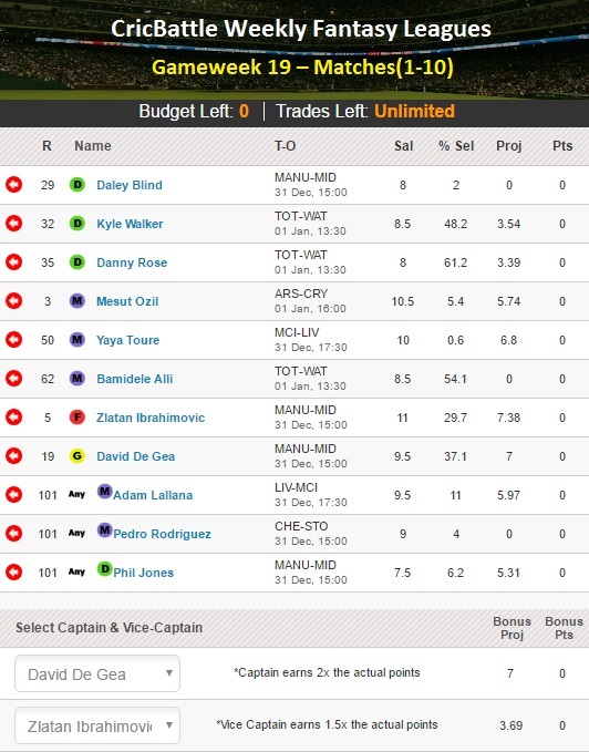 My XI – David De Gea (GK & Captain), Zlatan Ibrahimovic (Vice-Captain), Pedro Rodriguez, Mesut Ozil, Daley Blind, Kyle Walker, Danny Rose, Phil Jones, Yaya Toure, Bamidele Alli, Adam Lallana.