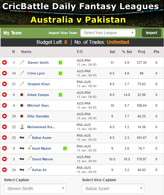 · My XI – Steve Smith (Captain),Babar Azam (Vice-Captain),Chris Lynn, Sharjeel Khan, Adam Zampa, Mitchell Starc, Billy Stanlake, Imad Wasim, Mohammad Rizwan, David Warner, Azhar Ali